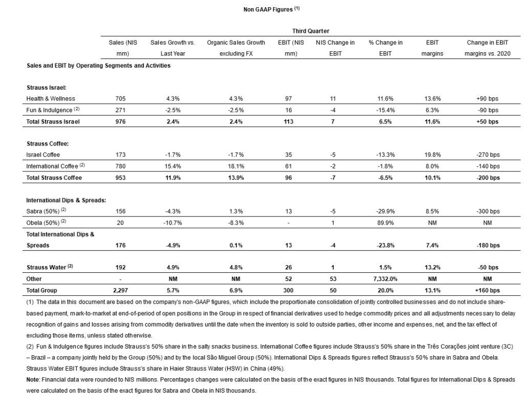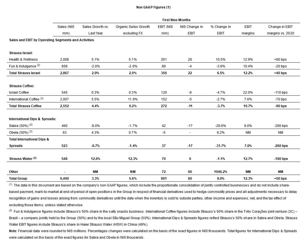 PETAH TIKVA, Israel — International food and beverage company Strauss Group published its financial statements for the third quarter of 2021. The financial statements demonstrate that the Group has continued the growth momentum as in the past quarters, with revenues for the quarter amounting to NIS 2.3 billion ($739.4 million), an increase of 6.9% compared to the corresponding period last year. Sales growth is evident in most of the company’s operations: Strauss’s activity in Israel, Strauss Water’s business, and the worldwide operations of Strauss Coffee. Sales of the dips and spreads company Sabra in the US in the quarter were stable.