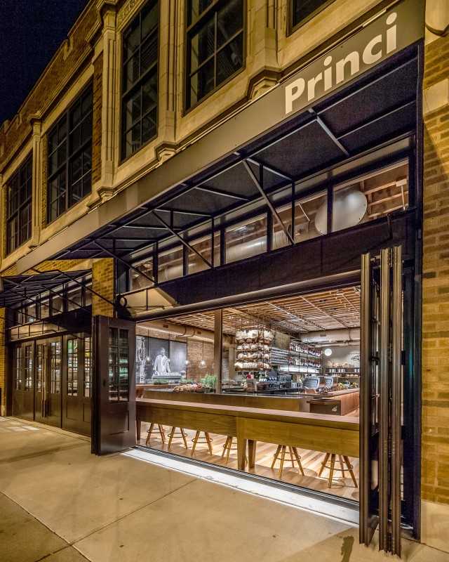 The new location, located in an industrial pre-war building in the West Loop neighborhood, is imbued with a feeling of history and charm with its exposed brick and wooden rafters. The layout is a first for a Princi location, with a long wrap-around counter that makes food and beverages the focal point, with Princi’s signature bread wall right at the center.