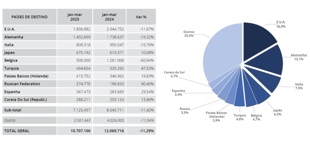 Exports to the USA and Germany were down by 11.7% and 19.3% respectively. Exports to Italy amounted to 800 318 bags, down 15.8% compared to Q1 2024. . Shipments to Japan recovered (+10.1%), while those to Belgium fell sharply (-60.1%).