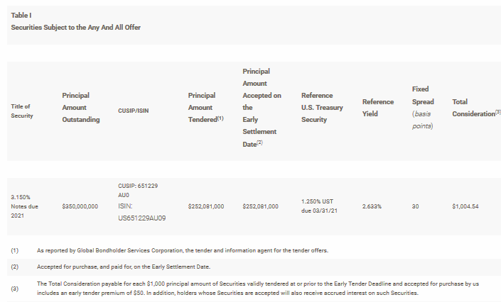 As listed in the tables above, on December 26, 2018 (the “Early Settlement Date”), the Company accepted for purchase, and paid for, $252,081,000 aggregate principal amount of its 3.150% Notes due 2021, $1,083,841,000 aggregate principal amount of its 5.500% Notes due 2046, $208,912,000 aggregate principal amount of its 3.900% Notes due 2025 and $80,166,000 aggregate principal amount of its 5.375% Notes due 2036 which had been validly tendered and not properly withdrawn at or prior to the Early Tender Deadline.