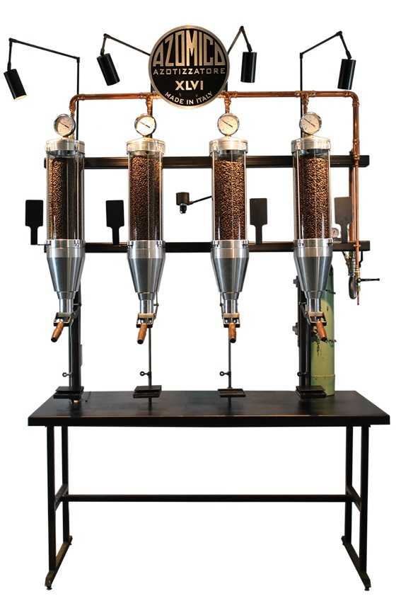 It is composed by one or more glass silos linked to a food nitrogen tank: we pour the coffee into the silos and open the tap of the nitrogen that invades coffee beans.