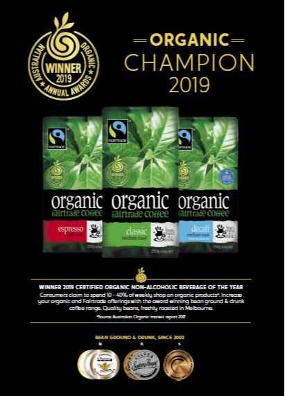 Bean ground & drunk was crowned “2019 Gold Champion Australian Certified Organic Non-Alcoholic Beverage of the Year” and is the first Certified Organic coffee in Australia.