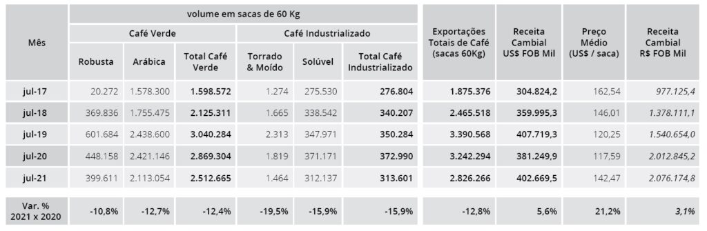 MILAN – In July, coffee exports from Brazil amounted to 2,826,266 million bags, or a 12.8% decrease over a year ago. Shipments of green coffee fell 12.4% to 2,512,665 bags, of which 2,113,054 (-12.7%) of Arabica and 399.611 bags (-10.8%) of Robusta. Exports of processed coffee (mostly soluble) were 15.9% down to 313.601 bags.