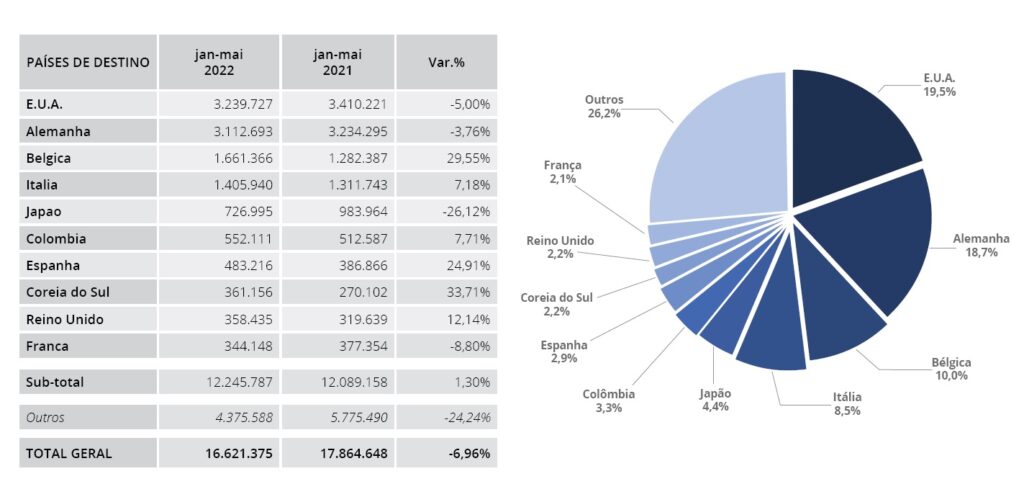 During the January to May period, exports to the US and Germany, Brazil’s main market destinations, fell by 5% and 3.8% respectively. On the other hand, exports to Belgium and Italy were up by 29.6% and 7.2% respectively.