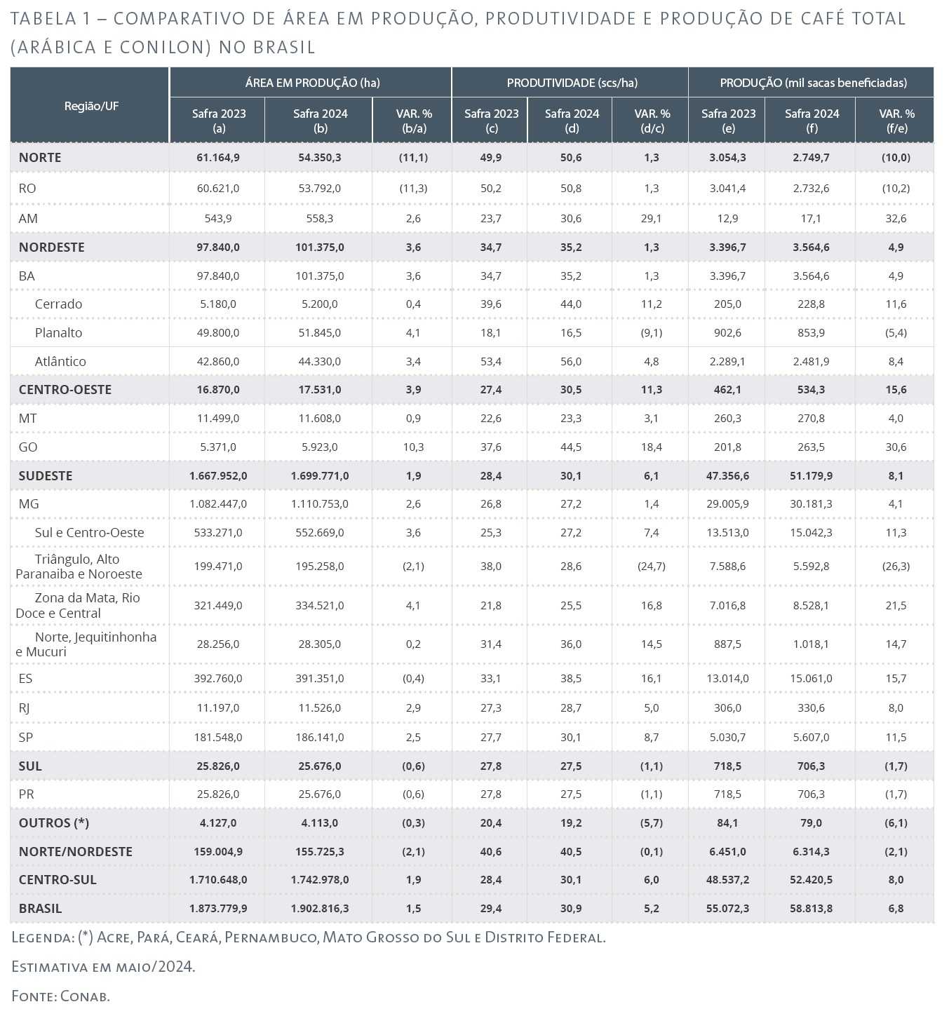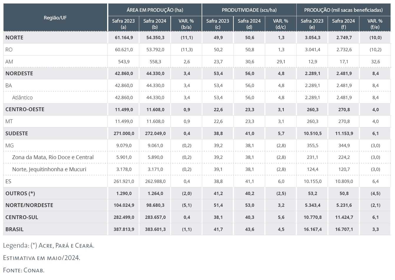 ConabProduction in Minas Gerais is seen up by 4.1%, to 30.2 million bags, due to a 1.4% increase in productivity, to 27.2 bags/ha, and an expansion of the area in production of 2.6%, to 1.11 million hectares.