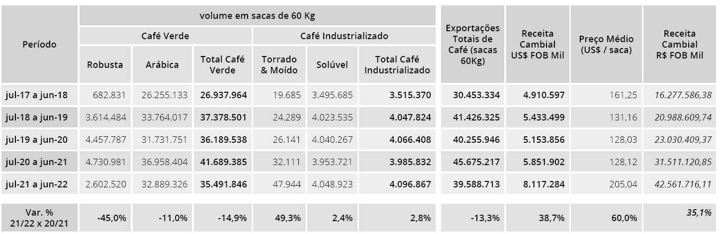 He stresses that, despite the drop in volume compared to the 2020/21 season, a record harvest year in Brazil, the amount shipped from July 2021 to June 2022 is still within the average of the last five harvests, which is 39.480 million bags.