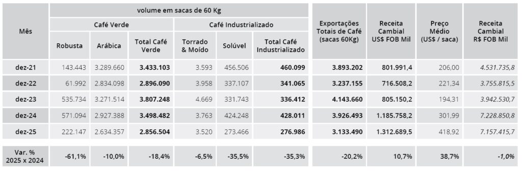 A similar decline was recorded in December: exports totalled 3,133,490 bags last month, a fall of 20.2% compared to December 2024.