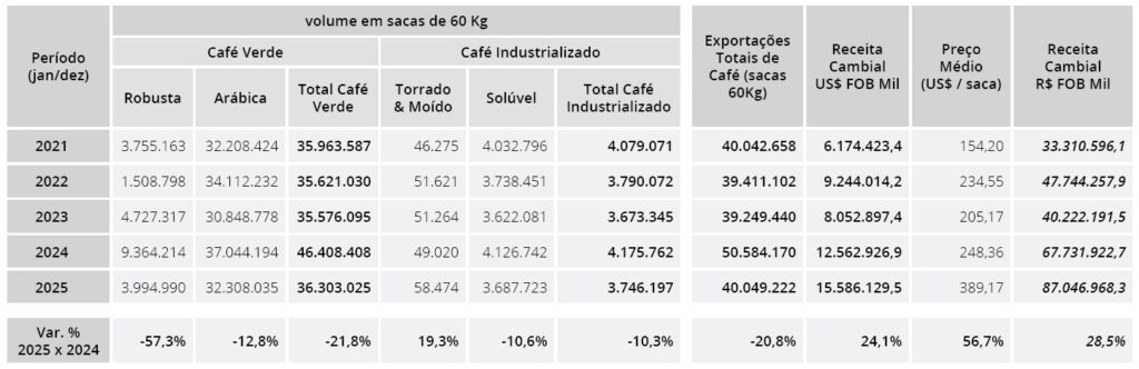Returning to the figures for the whole of 2025, green coffee exports fell by 21.8% to 36,303,025 bags, compared to the unprecedented figure of 46,408,408 bags in 2024.