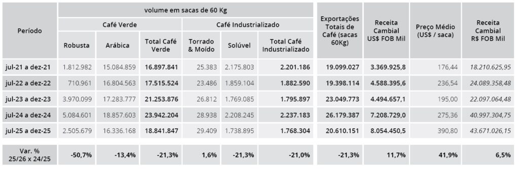 In the first half of the 2025/26 crop year (July-December), Brazilian exports of all forms of coffee fell to 20,610,151 bags, down 21.3% compared to the same period in 2024/25.