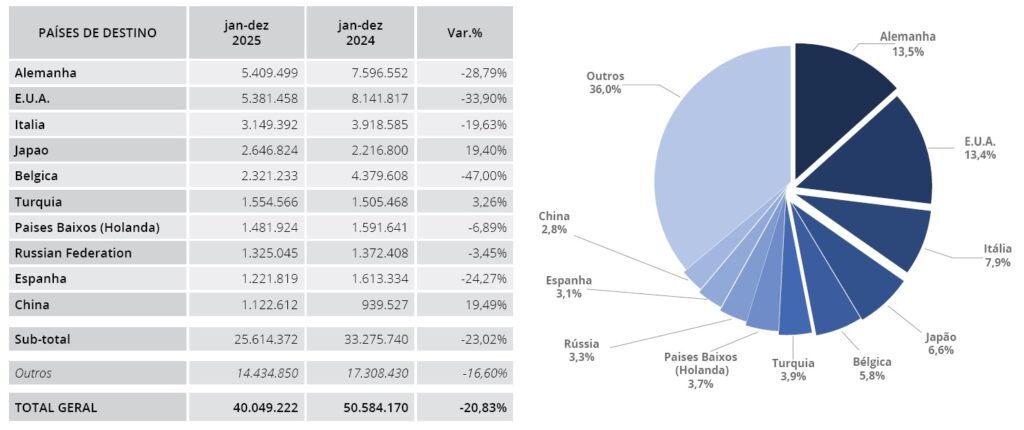 Looking at the 12-month period, Germany – despite a 28.8% decline – surpassed the US (-33.9%) to become the most important destination for Brazilian exports, with a volume of 5,409,499 bags. Despite lower shipments of 769,193 bags (-19.63%), Italy remains the third destination, with a volume of 3,149,392 bags, ahead of Japan (+19.4%) and Belgium (-47%).