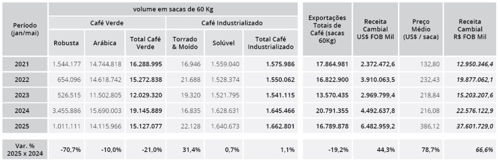 In the first five months of the year, exports totalled 16,789,878 bags: This is 19.2% less than in the same period of 2024, according to Cecafé. A total of 15,127,077 bags of green coffee were exported, which was a 21% decrease.