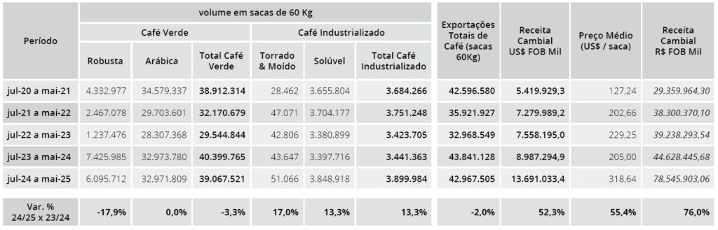 In fact, between July 2024 and May 2025, Brazil shipped 42,967,505 bags — just 2% less than last year’s record volume of 43,841,128 bags.