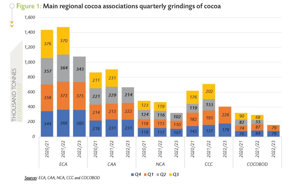 grindings data for the CCC and COCOBOD only covered the period through the second quarter (Q1.2023) of the 2022/23 cocoa year.