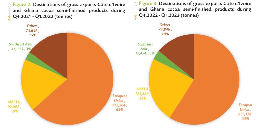 The European Union and the NAFTA countries were the top two regional destinations for Côte d’Ivoire and Ghana’s cocoa semi-finished products, while the share of Southeast Asia remained flat at 3%.