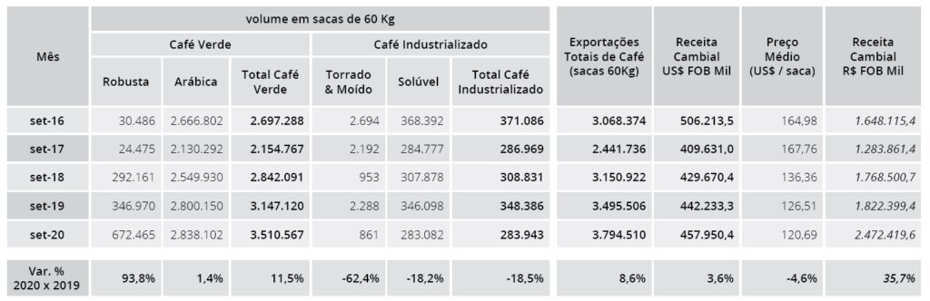Cumulative coffee exports from Brazil during the first 9 month of 2020 reached almost 30.5 million bags, a mere 0.6% less the last year.