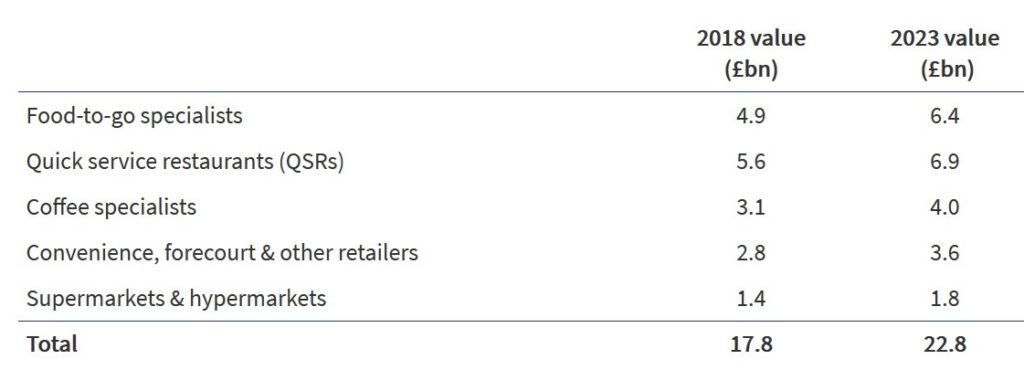 The UK’s food-to-go sector is set to grow at twice the rate of overall grocery retail, with international research organisation IGD predicting the channel to grow to £22.8bn by 2023, up from £17.8bn in 2018.