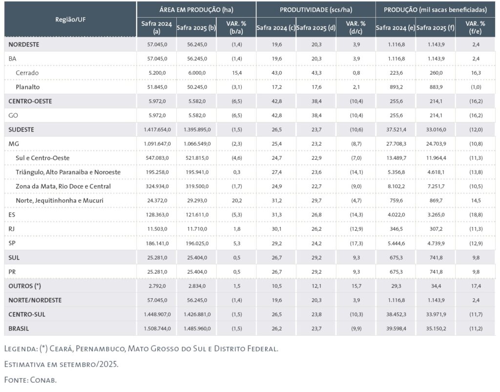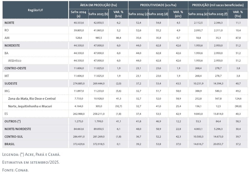 Meanwhile, production in EspÃrito Santo surged to 17.1 million bags (+23.2%), driven by a record Robusta harvest of 13.814 million bags (+40.3%), resulting in a productivity level of 53.5 bags/ha.