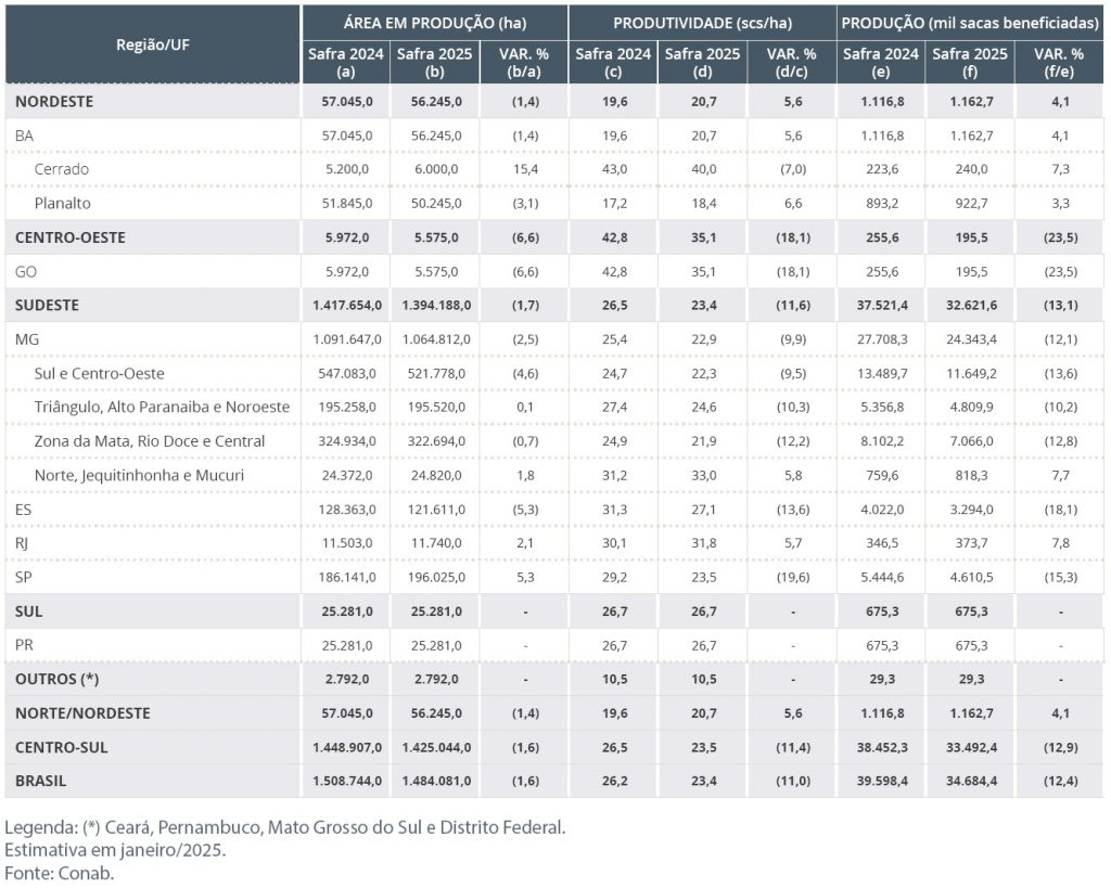 Below is a summary of the Conab estimate, followed by tables with estimates for Arabicas and Robustas