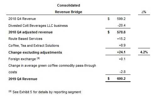 - Revenue was flat at $600 million (increased by 4% excluding the impact of foreign exchange, the divested Cott Beverages LLC business and the change in average cost of coffee), driven by organic growth within both the Route Based Services and the Coffee, Tea and Extract Solutions reporting segments, and the benefit of acquisitions. Revenue growth by segment in the quarter is tabulated below: