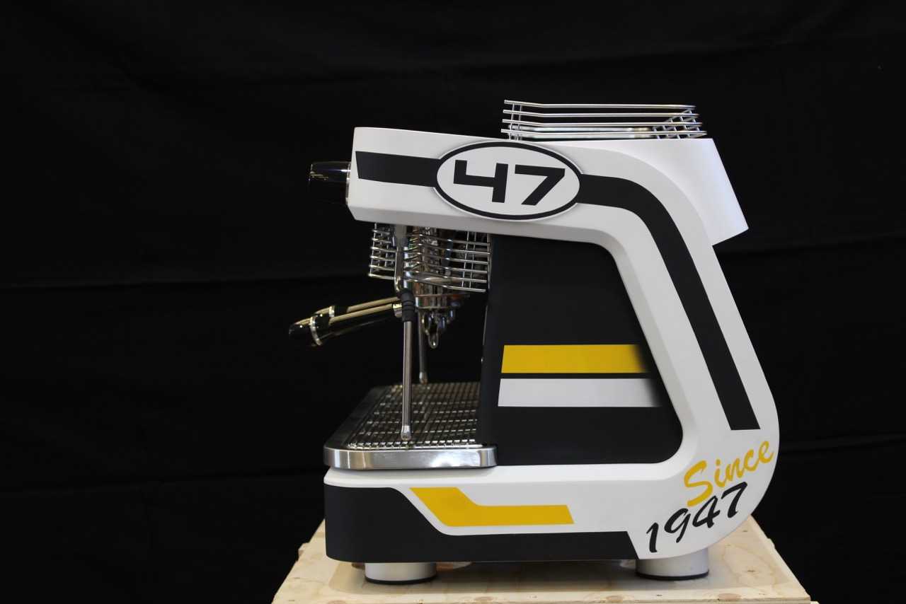 This particular design has yellow and black lines and the number 47, the year in which Bruno Dalla Corte started his journey into the world of espresso machine technology.