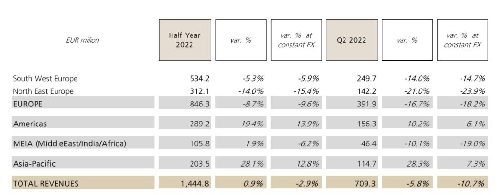 The second quarter saw revenues down by 5.8% (-10.7% at constant exchange rates) and an adjusted Ebitda of € 49 million (to 6.9% of revenues, from 16.3% in the second quarter of 2021).