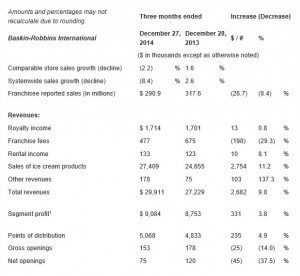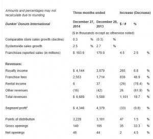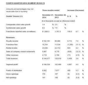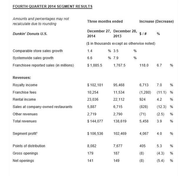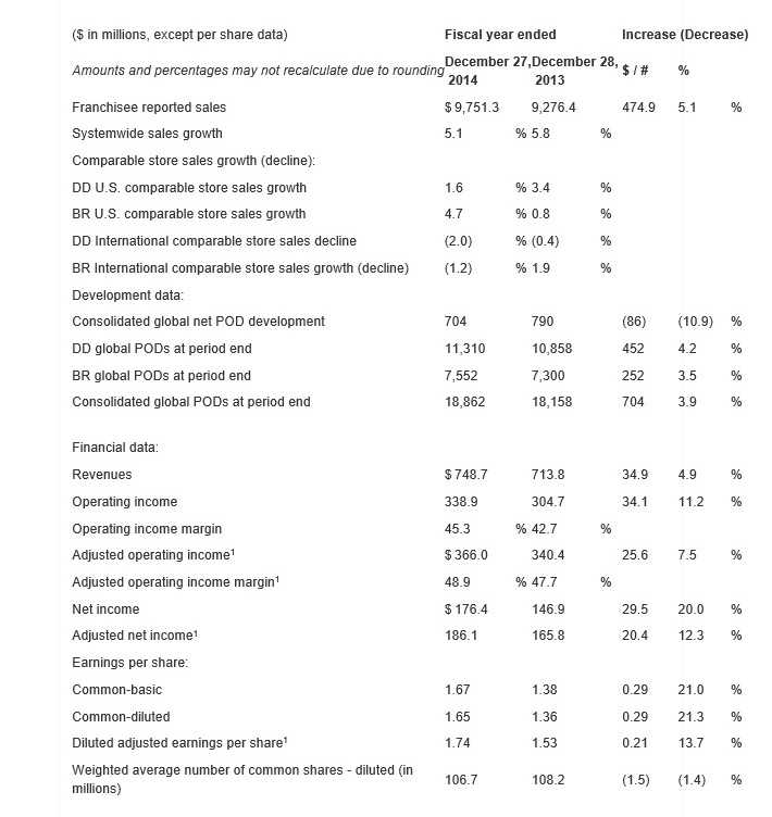CANTON, Mass. – Dunkin’ Brands Group, Inc. (Nasdaq: DNKN), the parent company of Dunkin’ Donuts (DD) and Baskin-Robbins (BR), on Thursday reported results for the fourth quarter ended December 27, 2014.