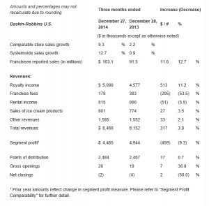 Baskin-Robbins U.S. fourth quarter revenue increased 3.9 percent from the prior year period to $8.5 million due primarily to increased royalty income, offset by a decrease in franchise fees driven primarily by timing of franchise renewals.