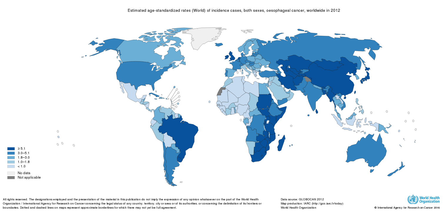 The highest rates of oesophageal cancer occur in parts of South America, East Africa, and Central and East Asia (shown in dark blue on the map; click on the map to enlarge).
