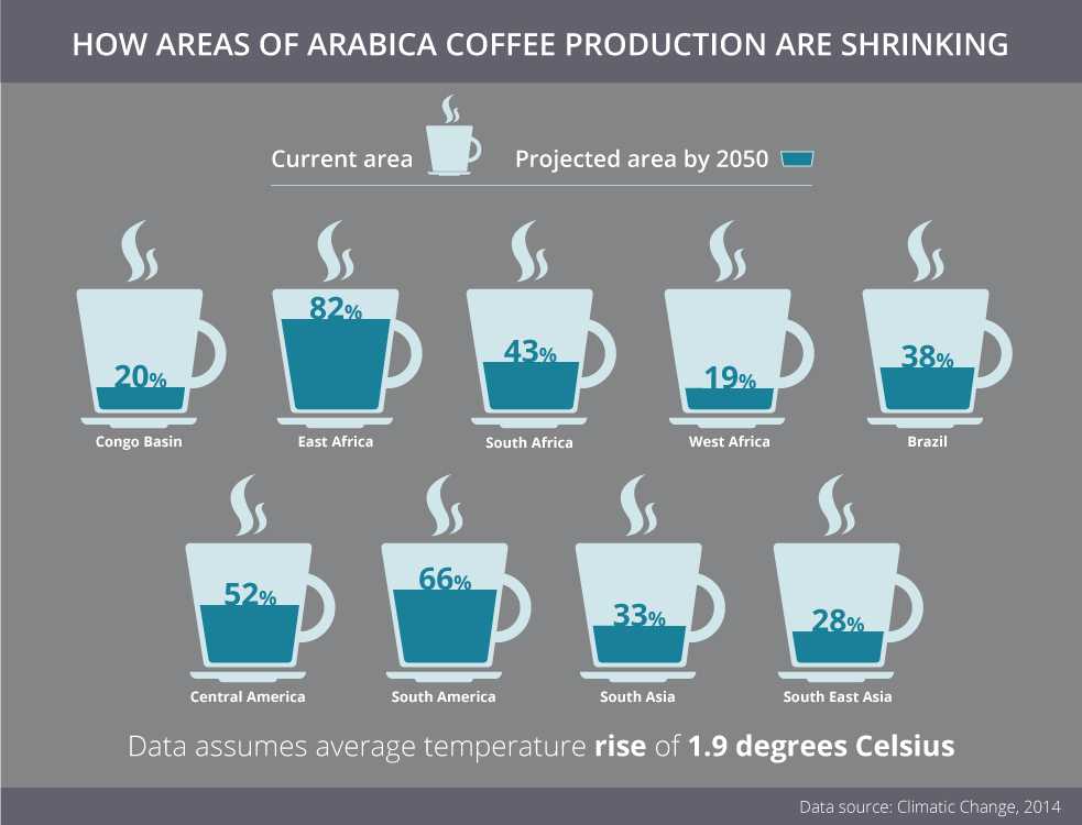 The top producers of arabica coffee beans today are in Brazil, Vietnam, Colombia and Indonesia, and half of all coffee is grown under full sun. These exposed coffee trees are increasingly vulnerable to the effects of climate change.