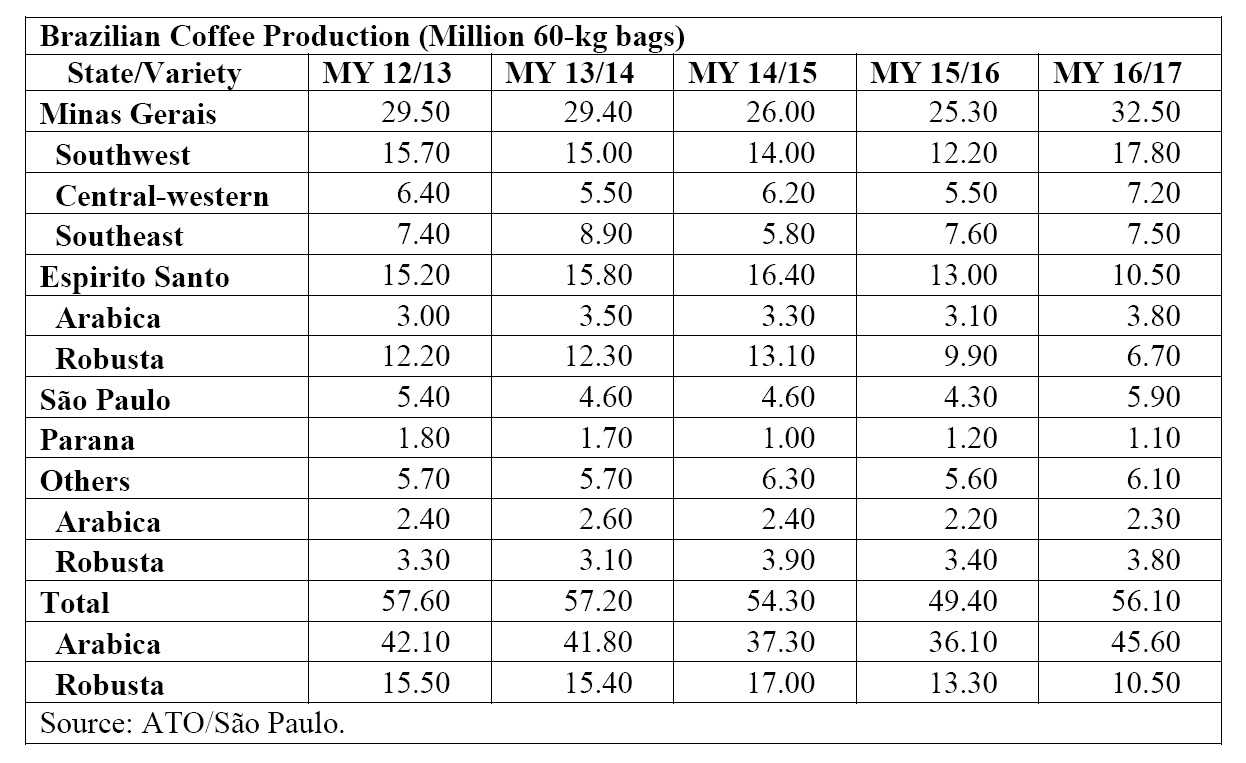 The Agricultural Trade Office (ATO) in São Paulo revised the Brazilian coffee production estimate for marketing year (MY) 2016/17 (July-June) up to 56.1 million 60-kg bags, green equivalent, an increase of 6.7 million bags relative to MY 2015/16 (49.4 million bags).