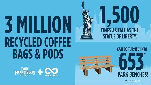 The Coffee Bag and Pod Free Recycling Program allows coffee drinkers to enjoy their favorite Gaviña Coffee Company products sustainably. Participants contribute to waste reduction by recycling empty coffee bags and used coffee pods and capsules from three Gaviña Coffee Company brands, including Don Francisco’s Coffee, José’s Gourmet Coffee and Café La Llave. In the four years of the partnership, enough coffee bags, pods and espresso capsules have been recycled to stand 1,500 times as tall as the Statue of Liberty when stacked end-to-end1 and enough material has been collected to create 653 park benches2.