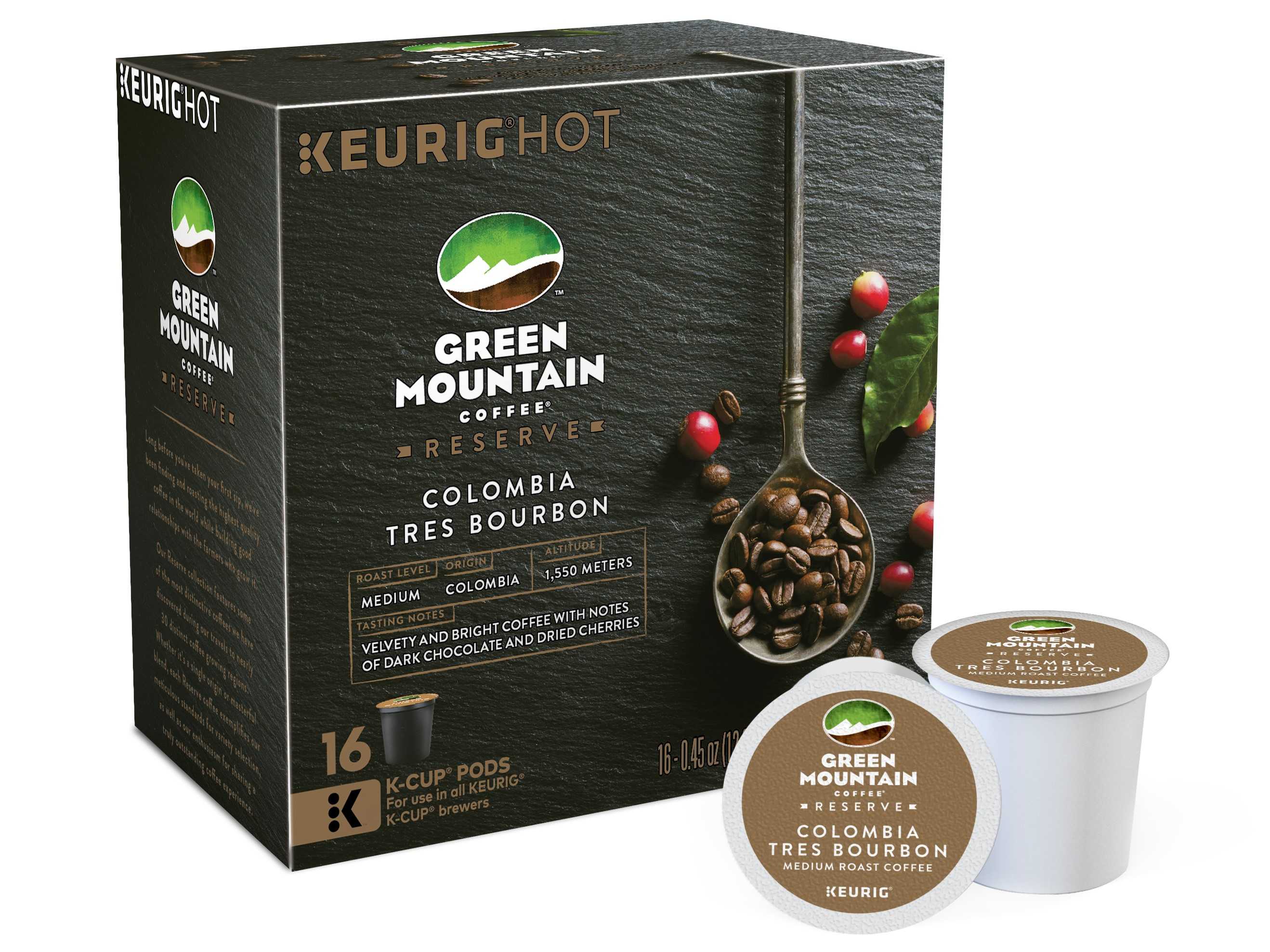 Green Mountain Coffee® Reserve Colombia Tres Bourbon is available in 16-count boxes of K-Cup pods for $32.99.