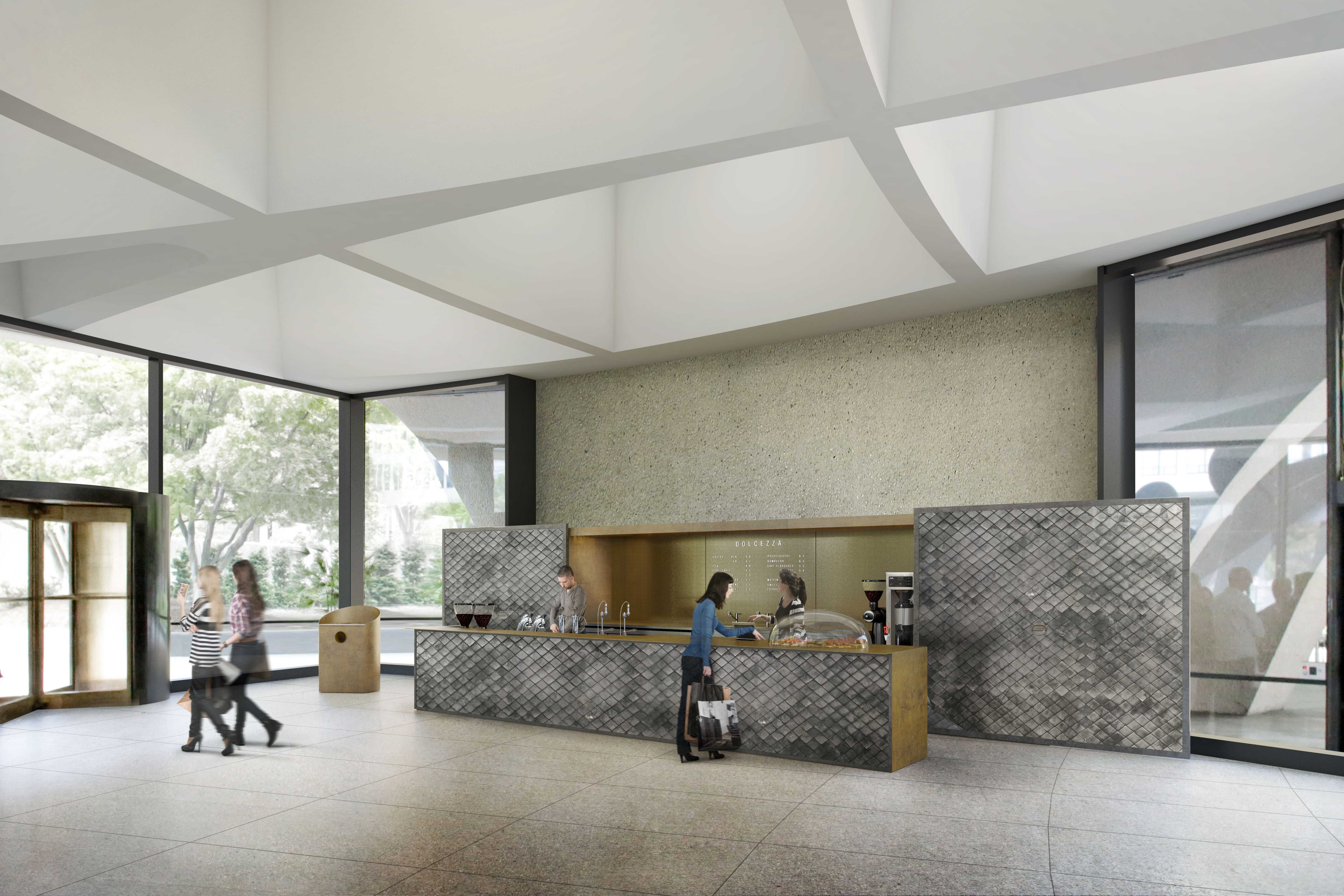 - Dramatic 20-foot metal coffee bar of tin and brushed brass, with tin diamond patterns inspired by innovative fireproofing techniques used in 1930s Tokyo. The menu behind the bar will a font designed by Sugimoto specifically for Dolcezza.
