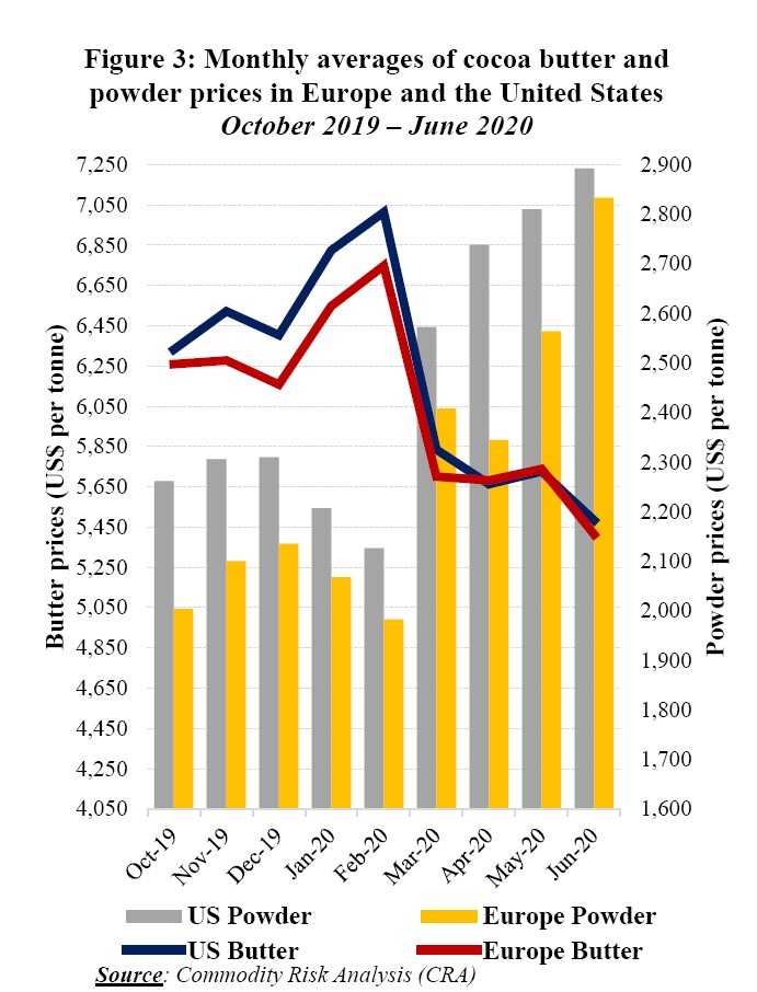 Finally, Figure 3 presents monthly averages of cocoa butter and powder prices in Europe and the United States since the start of the 2019/20 crop year.