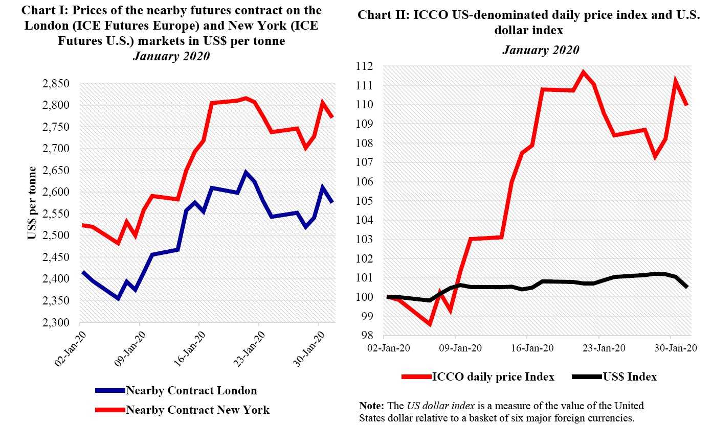Chart I shows the development of the nearby futures prices on the London and New York markets at the London closing time. Both prices are expressed in US dollars. Chart II depicts the change in the US-denominated ICCO daily price index and the US dollar index in January.