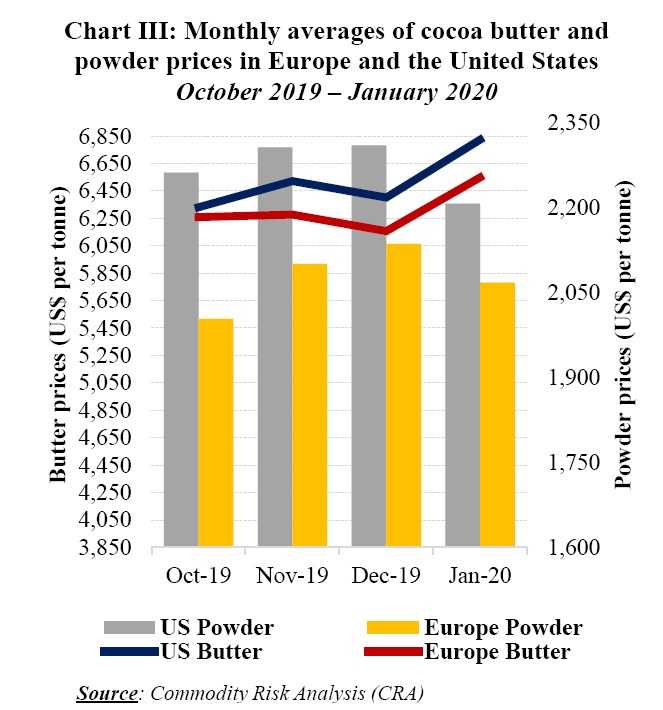 During the same time frame in Europe, powder prices rose by 3% from US$2,003 to US$2,067 per tonne. In addition, compared to their average values recorded in October 2019, the front-month cocoa futures contract prices firmed by 4% and 8% in London and New York respectively at the end of January 2020.