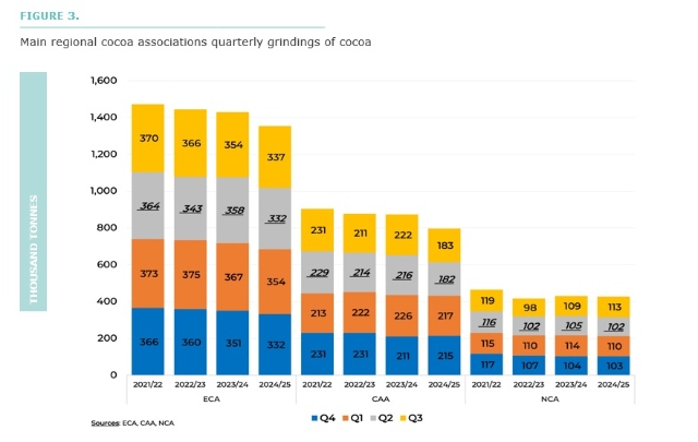 The weakness in cocoa demand may have also limited price momentum. As shown in Figure 3, Q3.2025 grindings data reported by the major regional associations in October 2025 revealed Asia as showing the steepest decline, while negative and positive grindings were noted for Europe and North America, respectively, due to reporting changes. The European Cocoa Association posted a drop of 4.8% year-on-year to 337,353 tonnes. Asia plunged by 17.1% year-on-year to 183,413 tonnes.