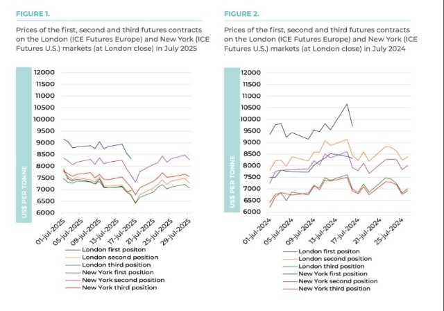 ABIDJAN, Côte d’Ivoire – According to Icco, the first half of July 2025 was characterized by a notable downward trend in cocoa futures prices (Figure 1), in contrast to the same period in July 2024, which saw prices climbing steadily (Figure 2). For the 2024/25 season, the lowest price recorded so far occurred in mid- July in London at US$6,443 per tonne while in New York the lowest price for the month at US$7,315 per tonne was a seven-month low.