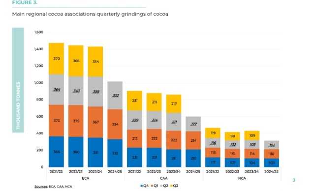 Bearish sentiments around demand also exerted downward pressure on prices. Persistently high cocoa prices may have dampened consumption, as reflected in lower Q2.25 grindings reported by all major regional cocoa associations.