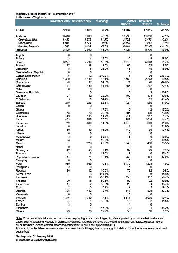 LONDON, UK – According to ICO’s monthly figures, world coffee exports amounted to 9.02 million bags in November 2017, down 9.2 percent from 9.93 million in November 2016.