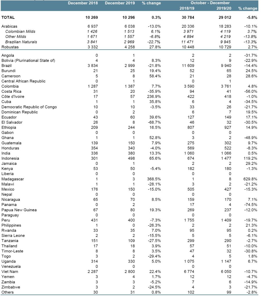Robusta exports were up 2.7% to 10.729 million bags.