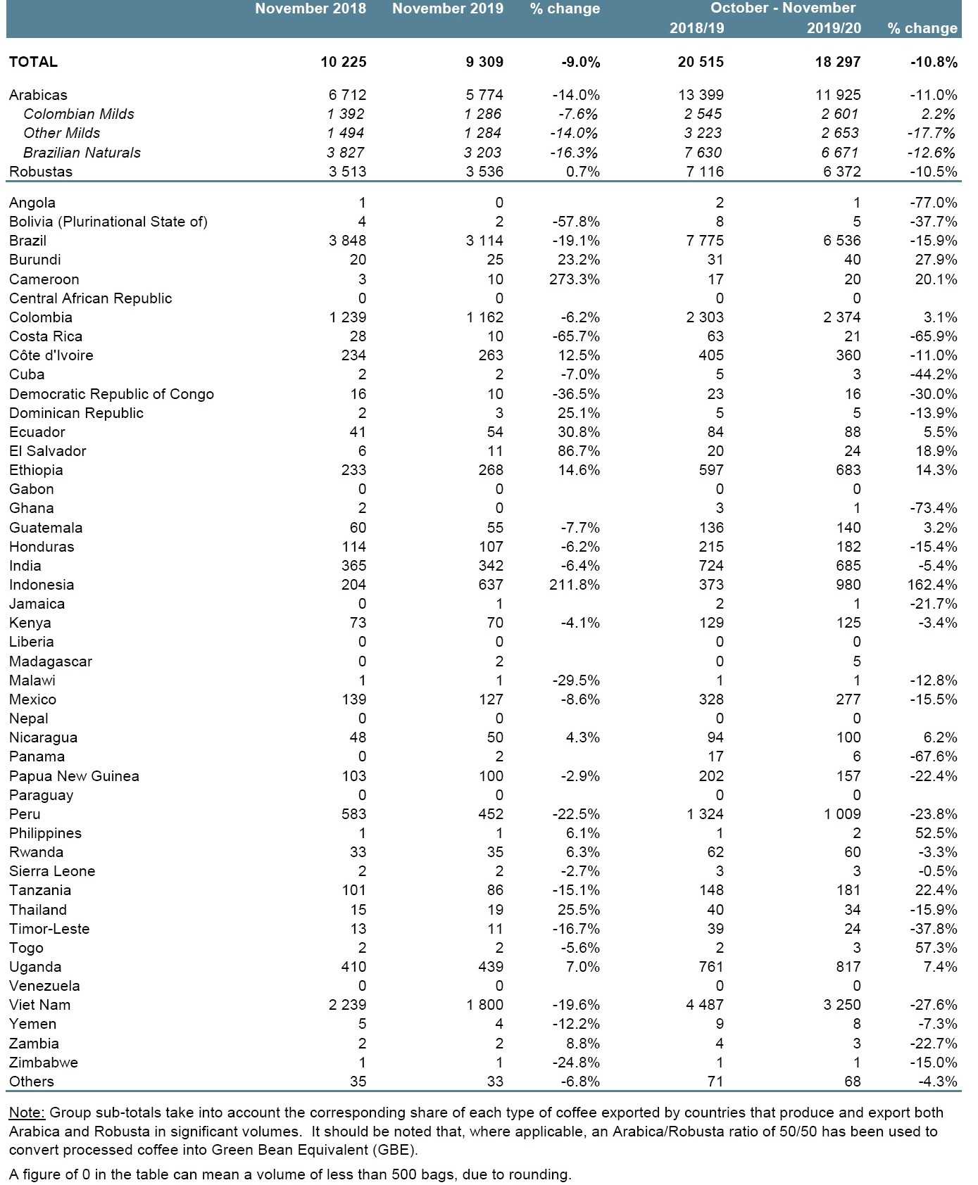 LONDON, UK – World coffee exports amounted to 9.31 million bags in November 2019, compared with 10.22 million in November 2018, down 10.8% on year. Exports of Arabicas were sharply down (-14%) to 5.774 million bags.