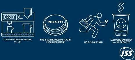 If a coffee machine is in need of service, users can simply press the Presto button located next to the machine, which will signal service professionals that the machine is faulty so they can fix it. After installing Presto at a customer site, ISS Sweden has noted an increase in customer satisfaction.