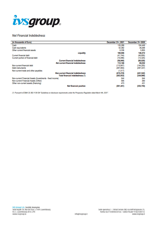 On December 23rd, 2021 IVS Group signed with a pool of banks, led by BNP PARIBAS, the refinancing of the bank facility signed on December 2018 (for an original amount of euro 150 million, already reduced to Euro 90 million in the first half of 2021 as only partially drawn), to the total present amount of euro 70 million and new maturity December 2025.