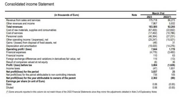 Consolidated Net Profit at March 2022 is equal to euro 3.04 million (with euro 0.7 million net profit attributable to minorities) compared to Euro 0.03 million of 2022. The Net Profit Adjusted for the exceptional items is equal to Euro 3.9 million, from euro 0.8 million at March 2022 (with euro 0.8 million minorities).