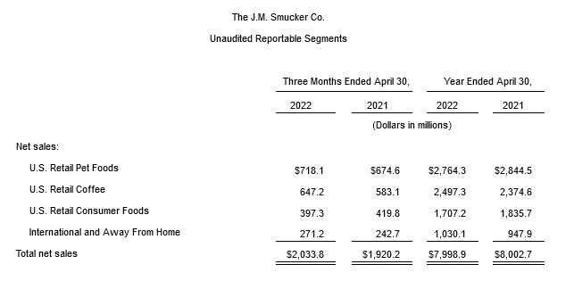 “Looking ahead to fiscal year 2023, we are focused on continuing the momentum of the business, investing in growth focused platforms such as Uncrustables®, partnering with retailers to restock Jif® products following the recent recall, and supporting our talented employees who are instrumental to our success. With strong underlying momentum across our portfolio of brands, we remain confident in our ability to execute our strategic priorities and support long-term shareholder value creation.”
