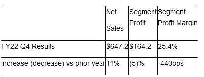 • The Company provided its fiscal year 2023 outlook, with an expected net sales increase of 3.5 to 4.5 percent, adjusted earnings per share to range from $7.85 to $8.25, and free cash flow of $500 million.
