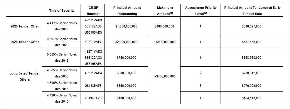 (1)$485,000,000 represents the maximum aggregate purchase price payable, excluding accrued and unpaid interest, in respect of the 2025 Notes that may be purchased in the 2025 Tender Offer. $929,000,000 represents the approximate total cash amount sufficient to accept for purchase all 2028 Notes validly tendered and not validly withdrawn prior to or at the Early Tender Date. $706,000,000 represents the approximate total cash amount sufficient to accept for purchase all 5.085% Senior Notes due 2048 and 4.985% Senior Notes due 2038 validly tendered and not validly withdrawn prior to or at the Early Tender Date.