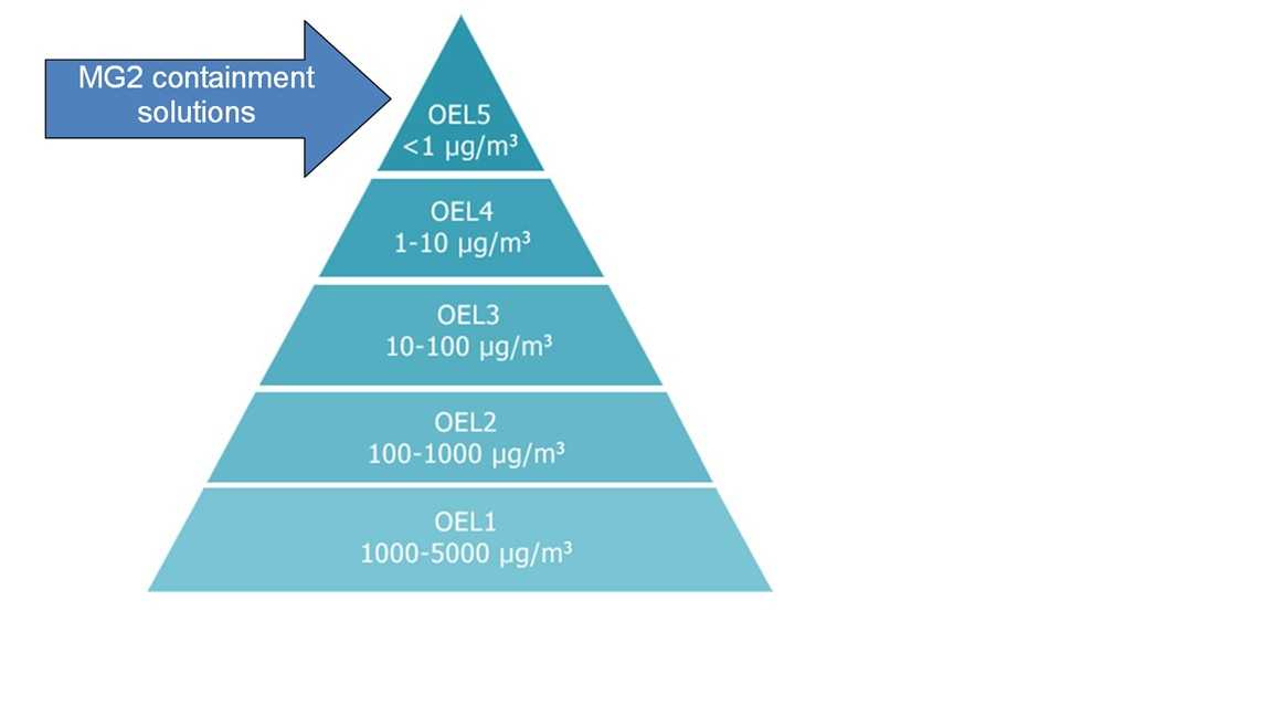 Based on the product to be handled the customer defines the best OEL level. Such limits are typically managed by means of a classification into OEB (Occupational Exposure Band) classes, which determine the admissibility range. For example, OEB 5 class covers the range between 0,1 µg and 1 µg of product per cubic meter.