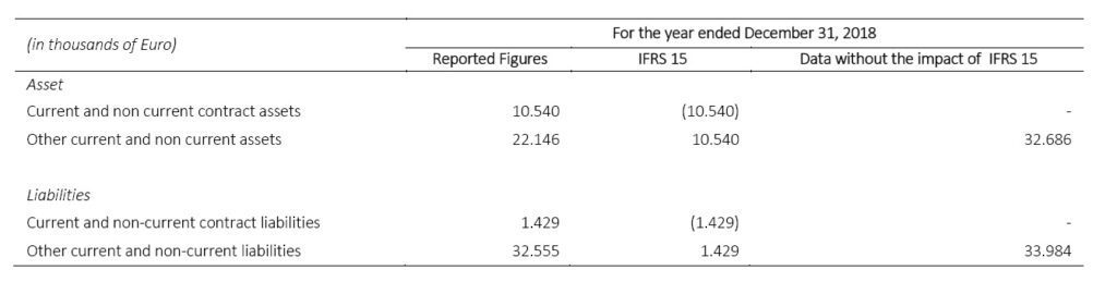 As mentioned above, when reporting the impact from the first adoption of IFRS 9, the Group has used the “modified retrospective method”. According to this method, the cumulated effects related to the implementation of the new standard are recorded in the “Retained Earnings” as at January 1 2018, without presenting the comparative amounts, as shown in the following table: